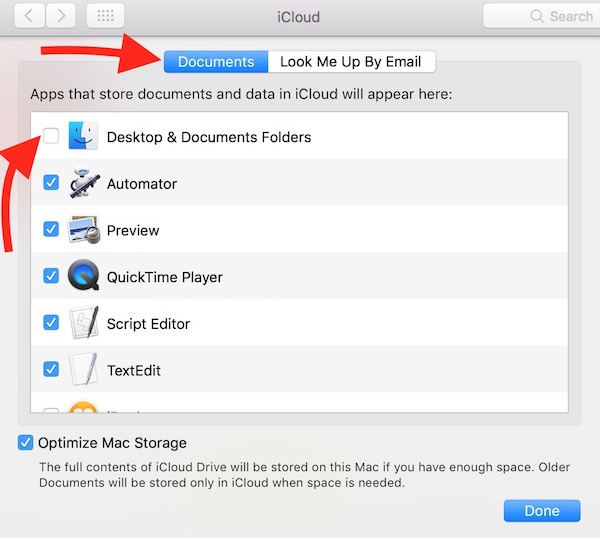 - Uncheck Desktop & Documents Folders to remove them (or you can check the option if you want to add them to iCloud Drive).