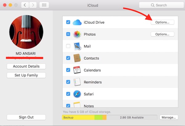 - Click on Options associated with iCloud (see the screenshot below).