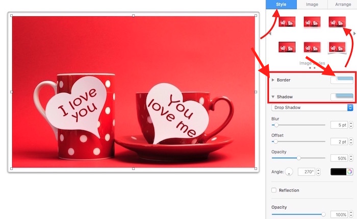 - Now you can customize Border and Shadow. Click on Arrow icon associated with Border or Shadow to change Border style, border color, border design etc..