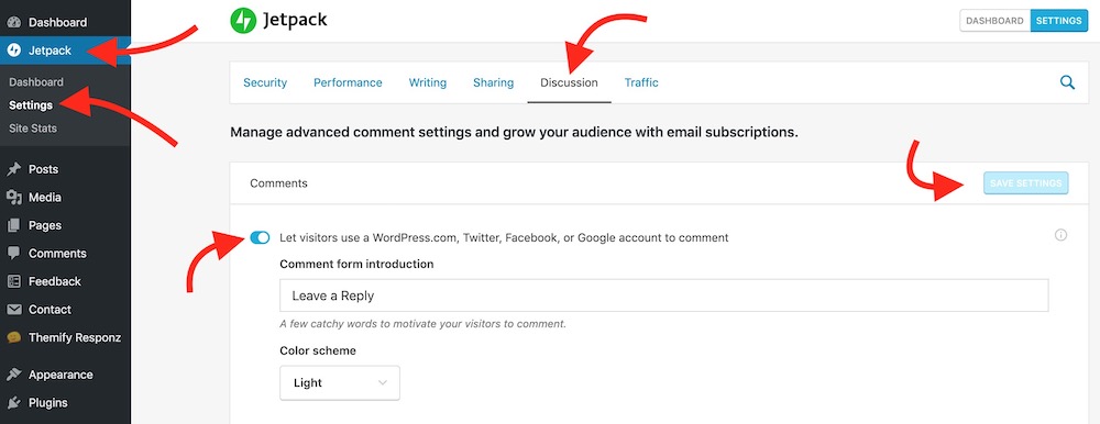 - Now select the Discussion tab as shown in the screenshot above and enable the option “Let Visitors Use a Wordpres.com, Twitter, Facebook, or Google account to comment.”