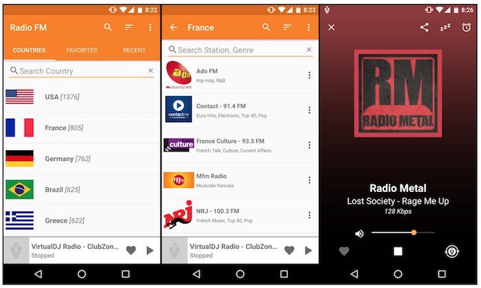 Radio FM could be the best application for those looking for radio channels sorted by Countries. It shows the list of countries, and the number of Radio Channels broadcasted from each country. There are also search fields to browse Country and Radio Channel. All the favorited channels are saved under the favorite tab and recently played stations can be located under the recent tab. Radio FM doesn’t provide any subscription or in-app purchase so far, so you get all the features for free.