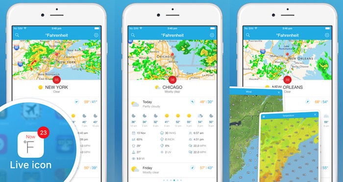 Like other application, this weather app also shows the current weather as well as forecast for up to 10 days with detailed information for every 3 hours. It comes with optional map integration that can be enabled of disabled. You can add many cities to get weather information, and swipe on the screen to switch to other city. The unique thing about this app is “showing temperature on the app icon.” You can see the current temperature on app icon without launching the app, but you will have to keep the background refresh enabled for this app. The free version of the is ad supported, and you can upgrade to premium ad-free version for $0.99 only. The app is compatible with iPhone, iPad and iPod Touch.