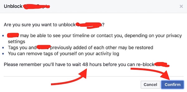 - Click Confirm to unblock (You can’t re-block anyone before 48 hours)
