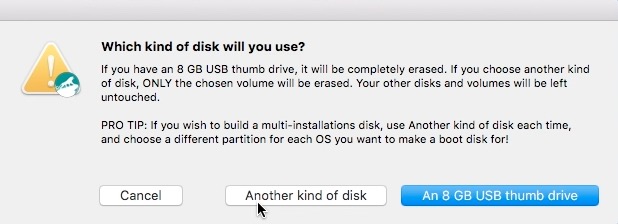 - Now select the kind of storage you are going to use to make OS X Installer. If it’s 8GB USB Stick, select “An 8GB thumb drive,” else hit “another kind of disk,” and select the drive/USB Stick that want to use