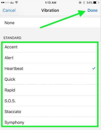 Now you will get a list, and “none” will be selected by default as vibration type. There are various vibration type that you can select from here, like Accent, Alert, Heartbeat and so on… You can select any, and tap Done. In may case, I have selected “Heartbeat”