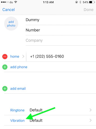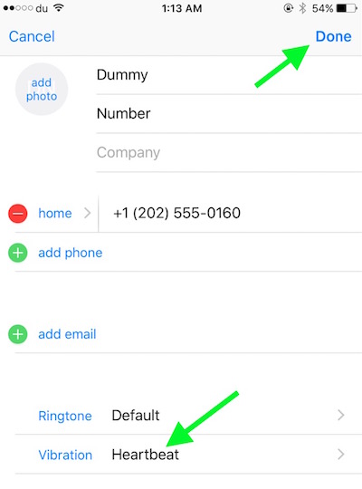You will be back to contact editing option, but now you will see the Vibration type you selected for the contact. Click on Done to save the setting