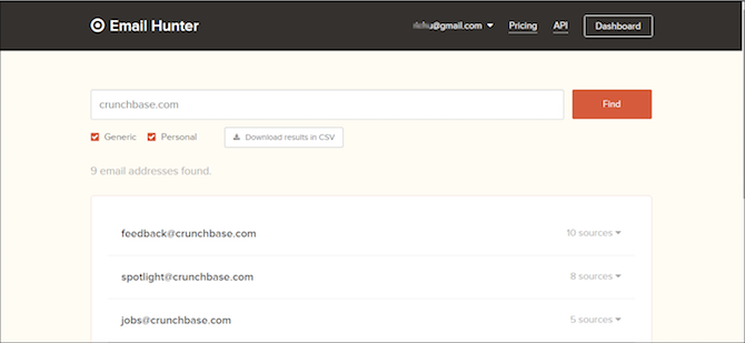 For the authentication purposes, Email Hunter will ask you to create an account after few search proceedings; it has kept a limit for the access. Once, if you have an account, you can search the sites for ‘Personal’ or ‘Generic’ addresses. Under ‘Personal’, it shows the personal sites available for the specified site whereas in ‘Generic’, you will come across the mix of the entire site (Personal and General).