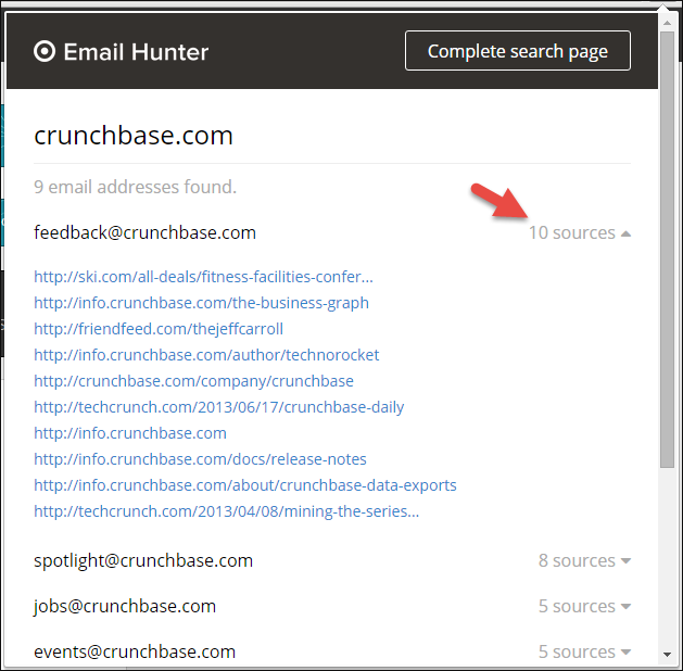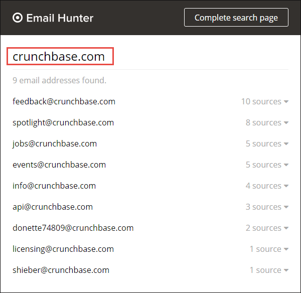 When searching for site crunchbase.com, the Email Hunter shows these results. You will be informed with the number of searches found with the corresponding site and the sources. The following segment gives you an elaborate idea of its working.