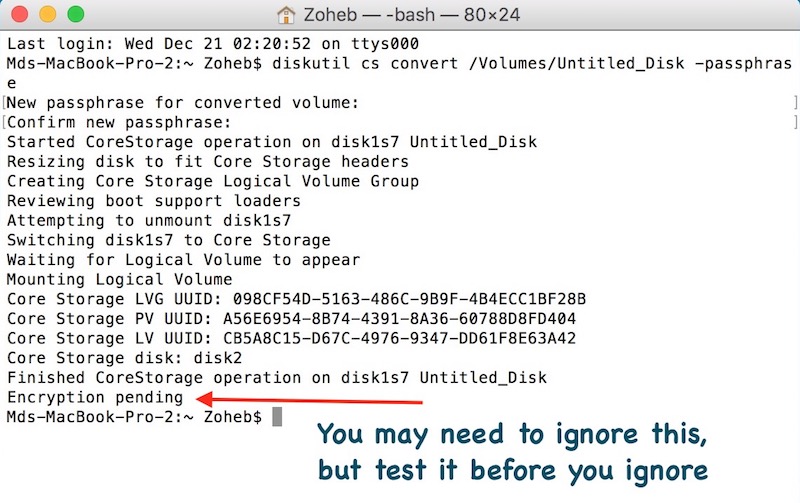 - Now the Encryption process will start, and the disk will be encrypted. You may see Encryption Pending message in Terminal, but you can ignore it for now.