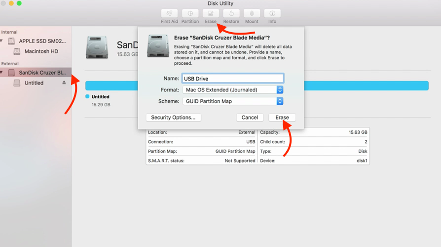 - Please make sure you have select GUID Partition Map and Mac OS Extended before clicking the Erase option.