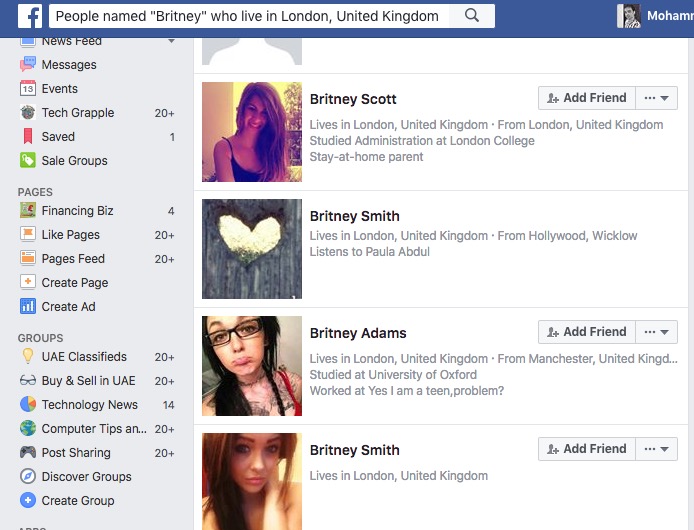 Type full name if you know, else partial name will also do. For example, I am looking for someone from London, I know the first name only (Britney). In such case, I will type; People named “Britney” who live in London, United Kingdom