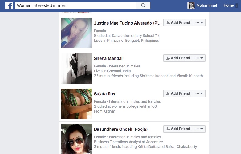 FaceBook is not really a dating website, but its custom search is very useful when you are looking for something specific. Whether you are a man and looking for a woman, or you are a man looking for a man, you can filter the result.