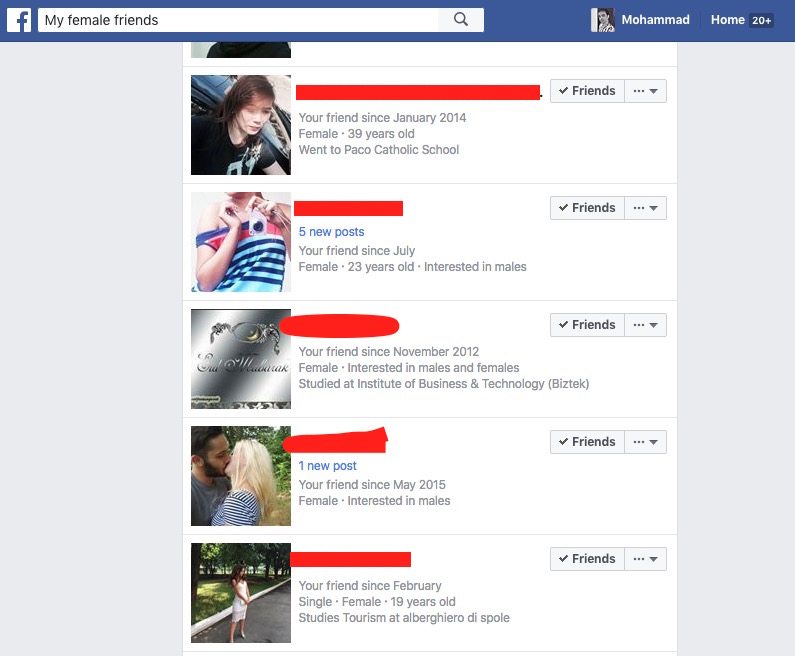 When you go to your Friends list, it shows all the friends including male and female. However, if you want to apply a filter and find your male and female friends separately, you can do it via Search. You can type “My Male Friends” or “My Female Friends” in search to filter the result.