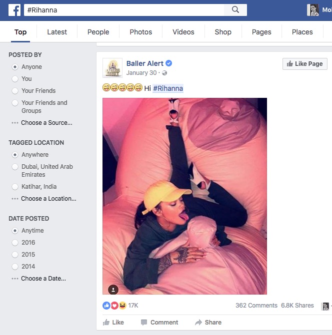 # tag is used to mention something or someone in a post. If you are looking for FaceBook posts for about certain things. You can use # tag in the search. For Example, If you are looking for posts that must have Rihanna mentioned in it or the posts that have been made to get Rihanna attention, you can type #Rihanna in FaceBook Search, and hit Enter. In the same way, you can also type #Product #UserName #BusinessName or anything to search.