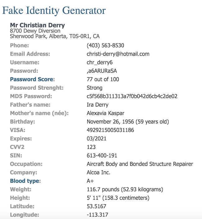 Here is one Sample, how does a Fake ID looks like Generated by Fake Name Generator
