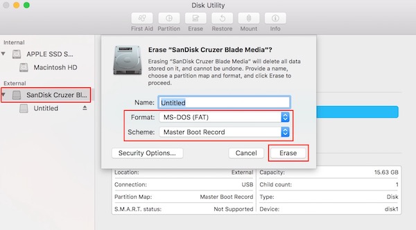 Under Disk Utility, select the External Drive. Select MS-Dos (FAT) for Format and Master Boot Record for Scheme, and then click on Erase option. Once formatting is complete, select its partition and format it as well selecting MS-DOS (FAT) option just like we did above.