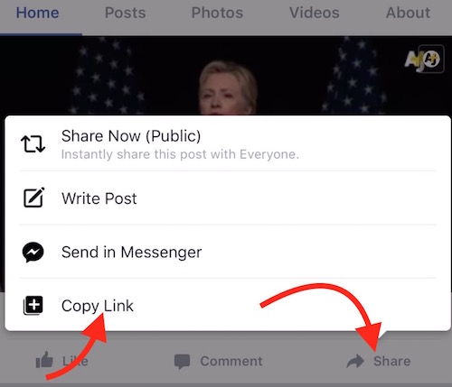 - When you see a video on FaceBook App, tap Share, and then tap Copy Link