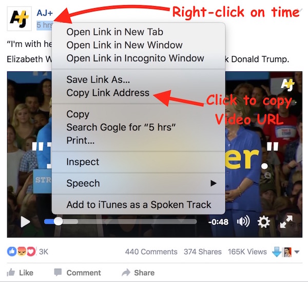 - While browsing FaceBook if you see any video, and you want to download, right-click on “time” (all video shows the time when it was posted)