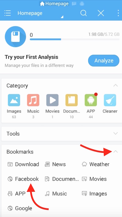 - Once installed, launch the application, tap the Bookmarks option, and hit FaceBook