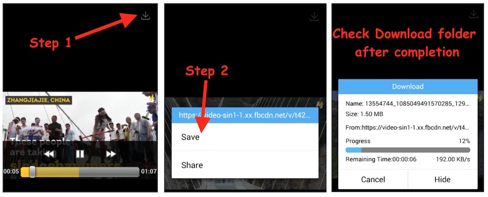 - While video is being played, you will see download icon. Tap on Download icon (located on the top right corner). Note : Some devices don’t play the video in full screen, and the video starts playing within FaceBook app. In such case, you need to tap and hold on the video, and then you will get Save and Share option