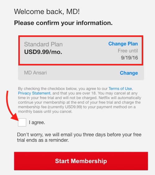 - Now check the box to agree with Netflix terms, and click on Start Membership option. It will show the amount as well as date until you can use the service for free