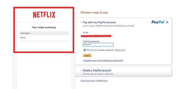 - Now you will be taken to PayPal website where you nee to enter your PayPal ID and Password, and login to proceed. Make sure that Netflix description (on the left) should not show any amount