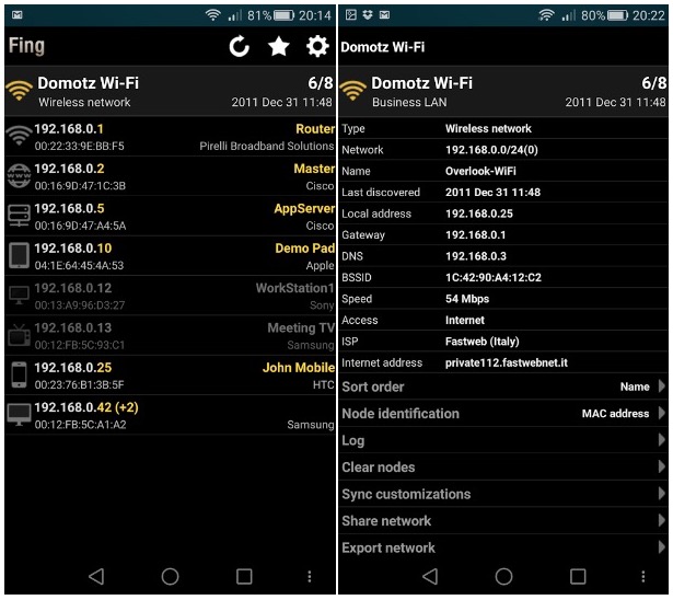 This app is developed and sold by Domotz Ltd. Fing Network Tools app is compatible with Android 2.3.3 and later version. The app shows the list of devices with their IPs and Mac Addresses that are connected to the same Wireless Network. This app can also be used to Scan TCP Services, Lookup DNS, Perform Ping, Trace route to custom target host etc..
