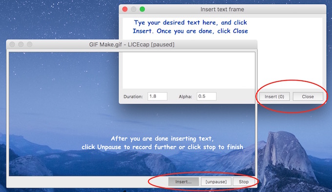 - If you want to insert text in your GIF image, you need to click on Pause, then Click on Insert, Type you desired text, Click on Insert. if you want to add more text, keep clicking Insert and add text. Once you are done, click on close