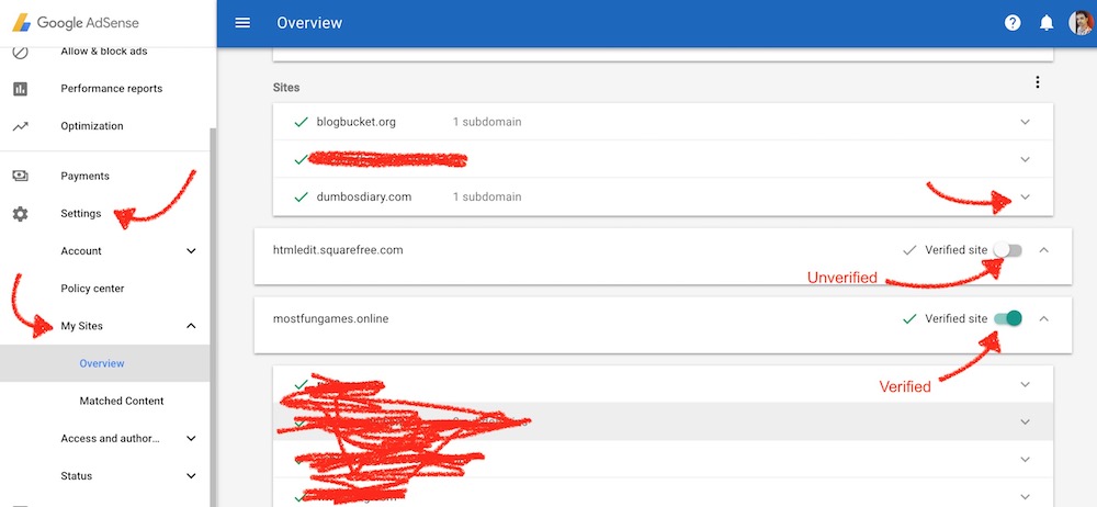 - Now you will see your sites there. Click on the arrow sign associated with each site. Click on that arrow sign and switch the Verified Button. All non-verified sites will have a switch in white color and the verified ones get the green switch. You should verify only those sites that you recognize