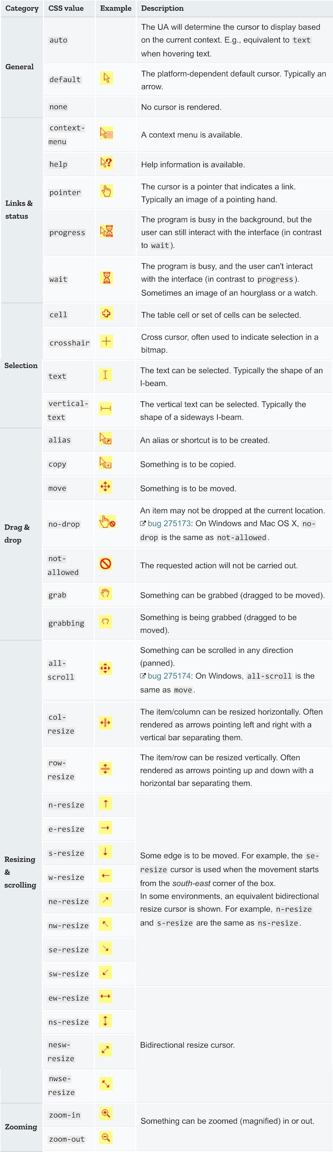 Change the Cursor-Property to anything mentioned above under Cursor Style list