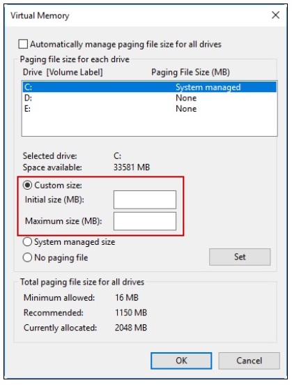 - Make sure to disable the checkbox that says, “Automatically manage paging file size for all drives”.