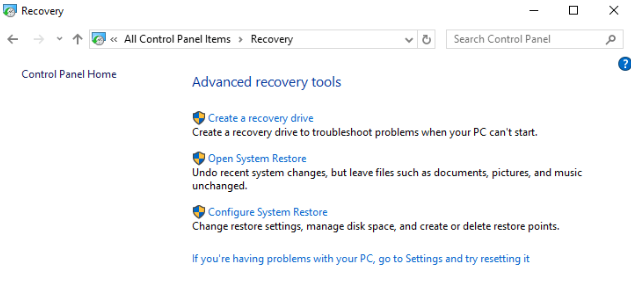 You can see different settings related to Windows 10 System Restore in the Control Panel > Recovery. You can click Open System Restore and follow the steps to roll back Windows to an earlier point in time.