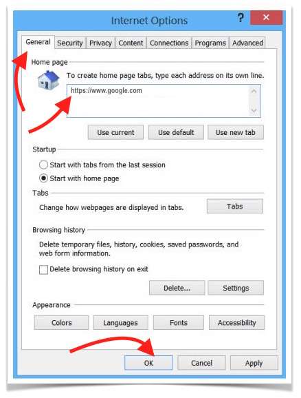 - Type Google URL in the Homepage field, click on Apply, and then hit OK.