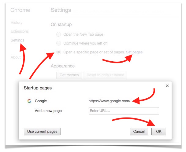 - Select “Open a specific page or set of pages” option, and then click “Set Pages.”
