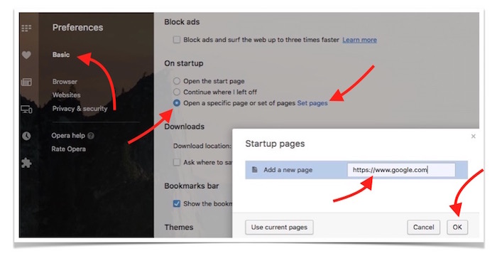 Opera browser for Windows and Mac already have Google Search bar on Homepage. So you can start searching right from there. If you still want to change, follow these steps;
