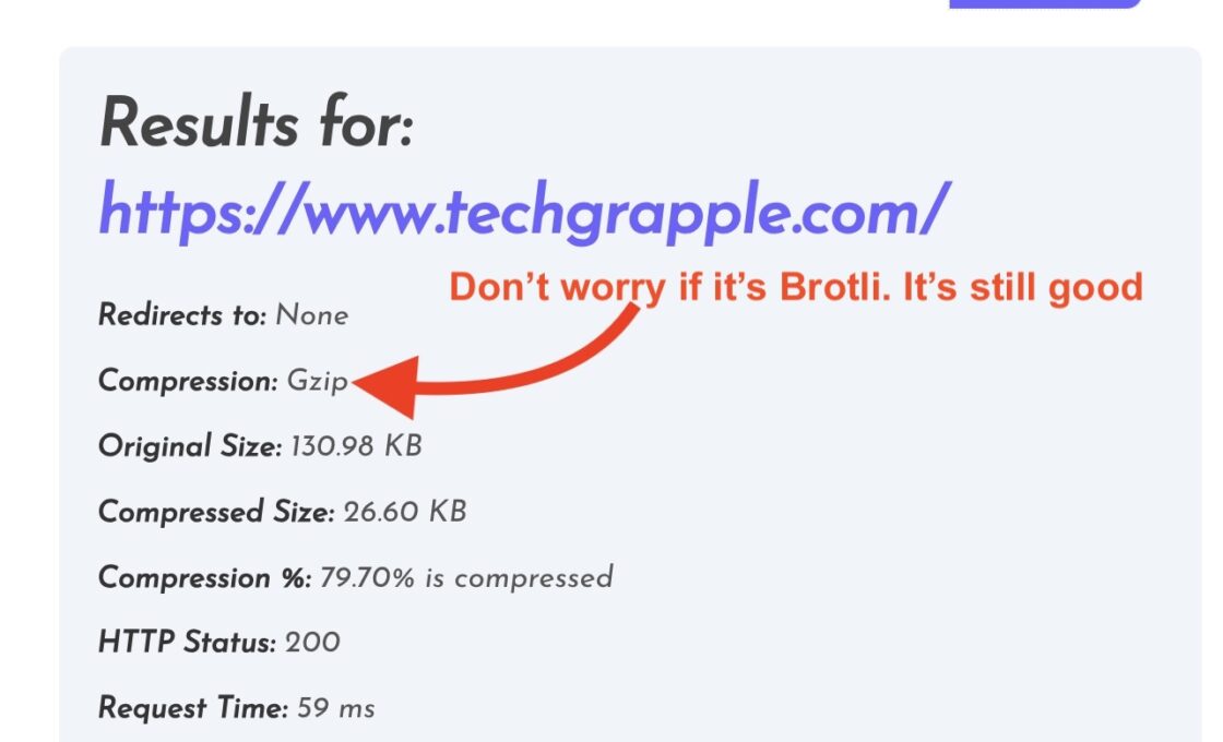 Check if your host offers compression for files known as GZIP or Brotli. If not, install a simple tool that does this. Smaller files mean faster loading. You can try this Gzip and Website Compression Checker tool to verify.