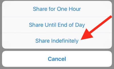 - Now you will get three options to share location, and you need to tap on Share Indefinitely. It will share the location with that contact for an unlimited or unspecified time. You can share for one hour or for a day as well if you want so