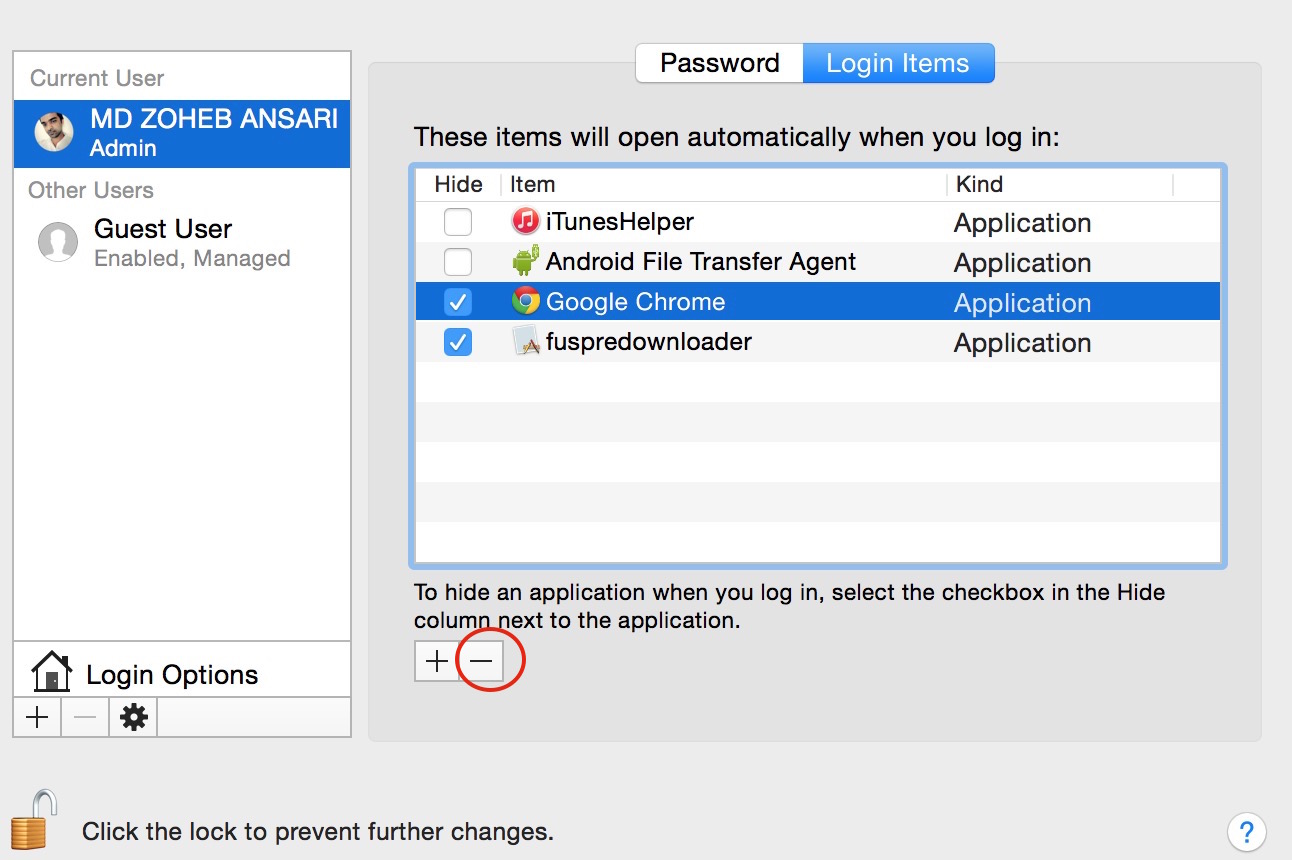 - Uncheck the item that you don’t want to be launched automatically when you turn on your MacBook OR Select the item and click on this Sign “-“ to remove the startup item