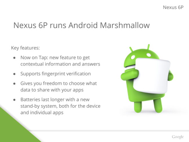 We don’t have information on Huawei Nexus 6P camera, but the slides only tell that Camera will be much better for low light photoshoot. It will be available in four colors; Aluminum, Graphite, Frost and Gold, but Gold color is only for Japan.
