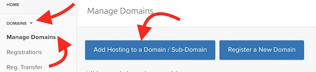 - Click on Domains option, and then select Manage Domains option. Then click on Add Hosting to a Domain/Sub-Domain. If you don’t own a domain, you can click on Register a New Domain option first to buy a new one, and then do this
