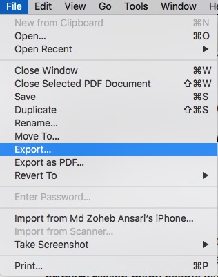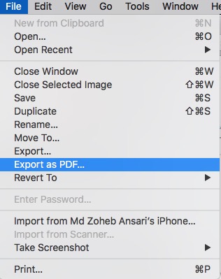 - Click on the File option in the menu bar, and select Export as PDF option.