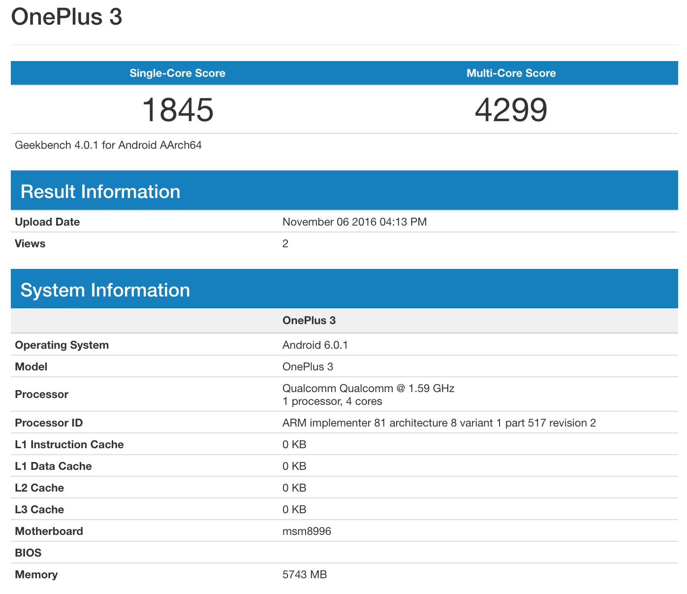 - Snapdragon 820 in OnePlus 3 : Quad-core (2 x 2.15 GHz Kryo + 2 x 1.6 GHz Kryo), Adreno 530 GPU