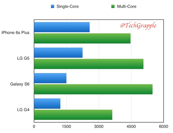 LG G5 features 4GB RAM compared to 3GB RAM in LG G4 and Galaxy S6, and 2GB RAM in iPhones 6s Plus. iPhone 6s Plus features dual-core Apple A9 CPU and PowerVR GT7600 six-core GPU, Galaxy S6 comes with octa-core Exynos 7420 CPU and Mali-T760MP8 GPU, LG G4 features a hexa-core Snapdragon 808 CPU combined with Adreno 418 GPU, and LG G5 has latest quad-core Snapdragon 820 CPU and Adreno 530 GPU inside.