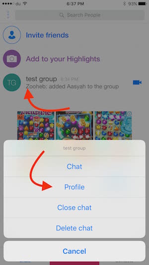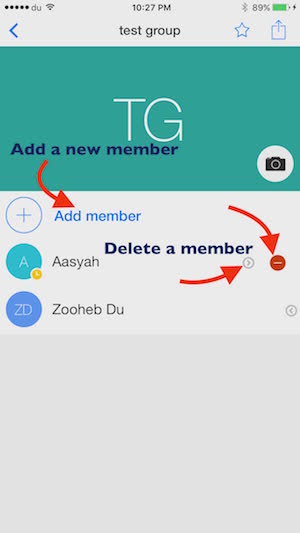 - Delete an existing member : To delete an existing member from the group, just hit the Chat option –> tap and hold the Group Name –> select Profile –> tap the arrow sign associated with the contact you want to delete –> tap minus (-) sign to remove the group member