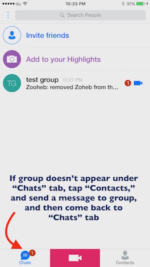 Note : If the group name doesn’t appear under Chats tab, tap Contacts, and send a message to group, and then select Chats tab again, and follow the procedure we explained above