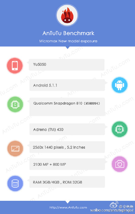 One of the weibo user posted the screenshot of Antutu that revealed the technical specifications and score. It would feature a 5.2-inch 2K display, Snapdragon 810 chipset, Adreno 430 GPU, 32 GB ROM, 21-megapixel front and 8-megapixel front camera. The RAM that showed up in Geekbench test was 4GB, and here it shows 3GB/4GB. Micromax may launch the device in two models. It would be running on Android Lollipop 5.1.1.