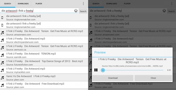 Music Maniac app comes with a very simple UI. When you launch the app, you get a search box where you can type Song, Artist or Album Name, and press OK button. Now you will see 2 tabs; Results and External Results. Most of the time, Results tab will find and show the music file you are looking for, and if it fails, tap on the External Results tab.