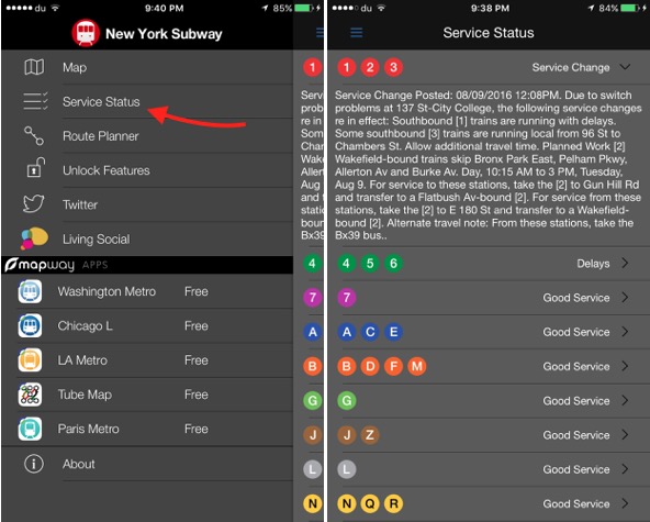 - This app keeps you updated with changes in services, delays etc.. Just hit theMenu Option, and tap Service Status. It will show all the sudden or planned changes, and also guides what you can do to travel further.