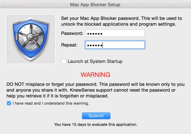 - launch the app and set the password, and click on submit (you should check the box to launch this app at system startup to protect the apps automatically when system is booted next time)