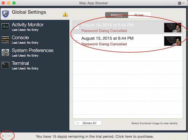 - Now you will get a Window that will show all the apps that was already added to the protected list. You also get a history tab that captures the photo and shows there each time someone fails to put the correct password. You can Select any app and click on minus sign (-) to remove the app from the protected list. Click on Plus sign (+) to add another app to the block list. You can add multiple apps to password protect individual apps on mac.